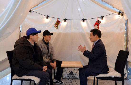 [프라임경제] 윤장현 광주광역시장이 21일 오후 1층 시민숲에서 열린 '청년 파란만장 전람회'에 참석해 청년들과 비밀의 방에서 청년의 목소리를 듣고 있다.
