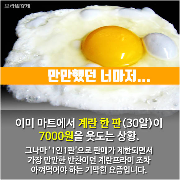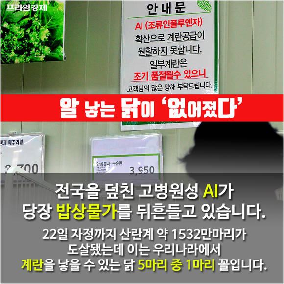 [프라임경제] 전국을 덮친 고병원성 AI가 당장 밥상물가까지 뒤흔들고 있다. 22일 자정까지 산란계 1532만여마리가 도살됐는데 이는 우리나라에서 계란을 낳을 수 있는 닭 5마리 중 1마리 꼴이다. 이미 마트에서 30개 들이 계란 한 판이 7000원을 웃돌고 그나마 '1인1판'으로 판매가 제한되면서 가장 만만한 반찬이던 계란프라이조차 아껴 먹어야 하는 기막힌 요즘이다.