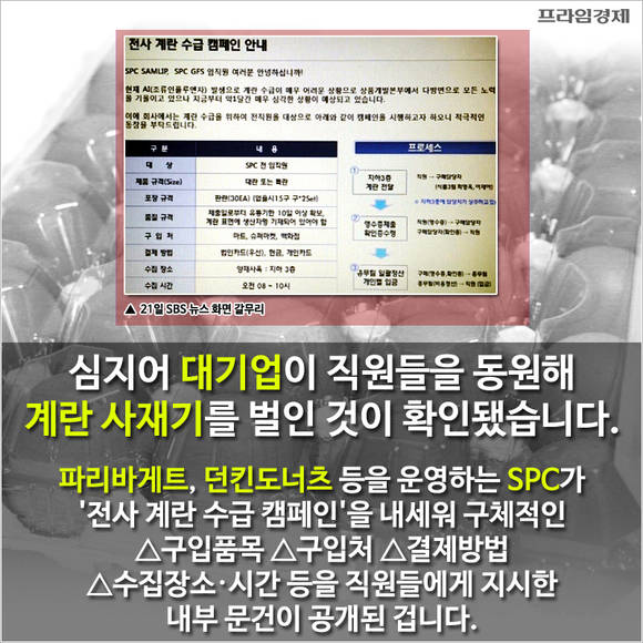 이런 가운데 대기업까지 직원들을 동원해 계란 사재기에 나선 정황이 포착돼 충격을 줬다. 파리바게트, 던킨도너츠 등을 운영하는 SPC가 '전사 계란 수급 캠페인'을 내세워 구체적인 구입품목과 구입처, 결제방법, 수집장소·시간 등을 직원들에게 지시한 내부 문건이 21일 공개된 것이다.