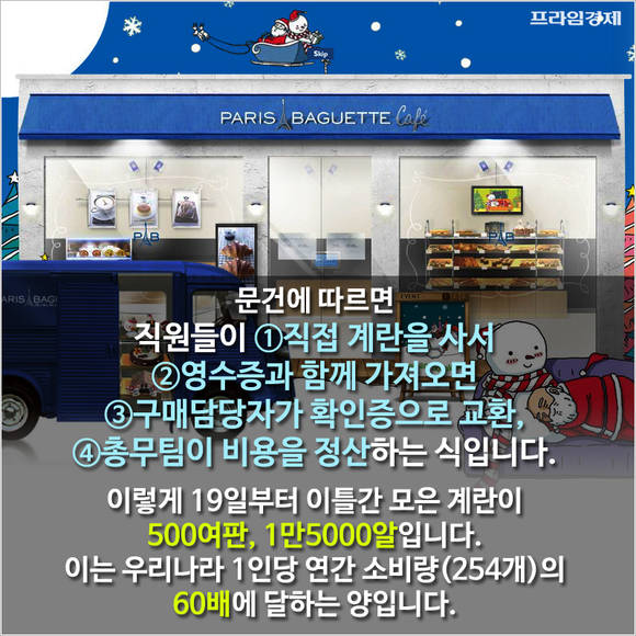 이렇게 지난 19일부터 이틀 동안 모은 계란이 500여판, 1만5000알에 이르는 것으로 알려졌다. 지난해 우리나라 1인당 연간 계란 소비량(254개)의 60배에 달하는 양으로 직원들이 사온 계란들은 경기도 성남 제빵공장으로 향한 것이 전해졌다.
