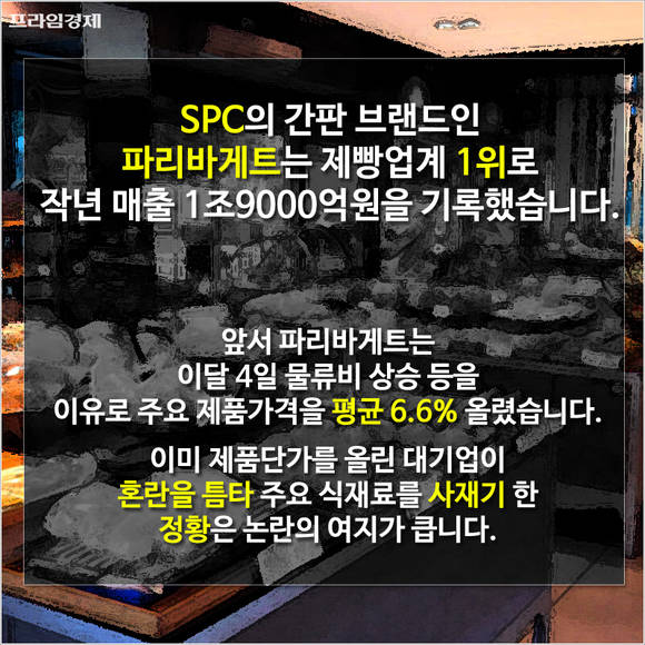 이와 별개로 파리바게트는 지난 4일 주요 제품 가격을 평균 6.6% 올린 바 있다. 일련의 상황은 당시 관리비 상승을 내세워 제품단가를 올린 SPC가 혼란을 틈타 주요 식재료를 사재기 한 정황이 드러난 것으로 볼 수 있다.