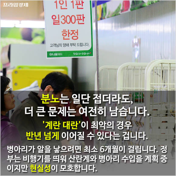 더 심각한 것은 문제의 '계란 대란'이 최악의 경우 향후 반년 이상 장기화될 수 있다는 점이다. 병아리가 알을 낳기까지 보통 6개월 정도 걸리는 탓인데 정부는 산란계와 병아리를 해외 수입하고 아예 계란을 직접 들여오겠다는 안을 내놨지만 실현될지는 의문이다.