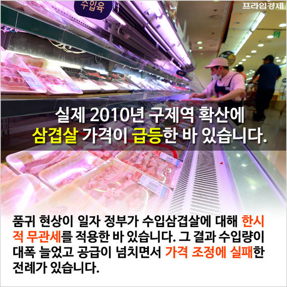 실제 2010년 구제역 확산에 삼겹살 품귀 현상이 벌어지자 정부가 수입삼겹살에 대해 한시적 무관세를 적용해 수입량이 대폭 늘렸다. 공급이 넘치면서 결국 가격 조정에 실패한 전례가 있다.