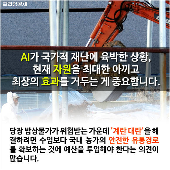 이미 AI가 국가적 재난 수준에 육박한 상황에서 보유한 자원을 최대한 아끼고 최고의 효과를 거두는 것이 최선이다. 당장 밥상물가가 위협받는 가운데 '계란 대란'을 해결하려면 수입보다 국내 농가의 안전한 유통경로를 확보하는 게 먼저라는 전문가 의견이 많다.