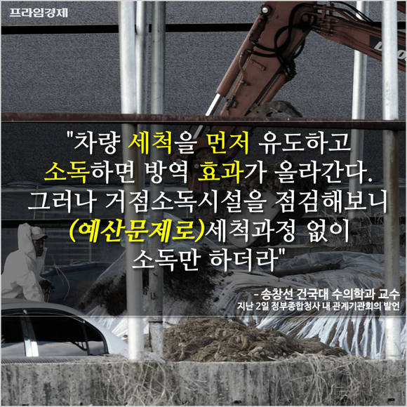 지난 2일 열린 관계기관회의에서 송창선 건국대 수의학과 교수는 "차량 세척을 먼저 유도하고 소독하면 방역 효과가 올라간다"며 "그러나 거점소독시설을 점검해 보니 (예산문제로)세척을 하지 않고 소독만 하더라"고 지적했다.