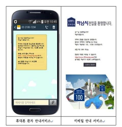 도로명주소 문자안내서비스는 행정자치부와 ㈜KT간 업무협약에 따라 추진하는 사업이다. 전입신고시 기재된 휴대폰 번호나 이메일 주소로 전입신고 처리 이후 도로명주소를 송부해 주소이용에 불편이 없도록 하기 위해 제공되는 서비스다.