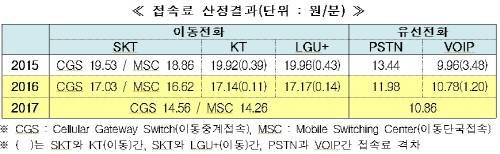 유선전화접속료는 2015년 분당 13.44원에서 2016년 11.98원으로 분당 1.46원 인하했다. 유·무선 간 접속료 격차는 2015년 분당 6.09원에서 2016년 5.05원으로 축소했다.