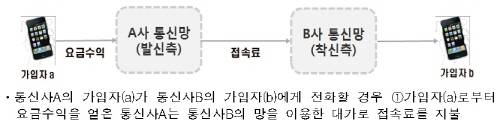 예를 들어 SK텔레콤 가입자 A가 KT의 가입자 B에게 전화할 경우, A로부터 요금수익을 얻은 SK텔레콤은 KT 망을 이용한 대가로 접속료를 지불해야 하는 것.