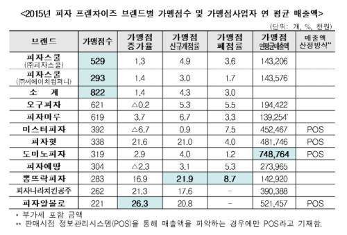 이 중 가맹점 증가율은 피자알볼로(26.3%)가 가장 높았으며 뽕뜨락피자의 가맹점 신규 개점률(21.9%)과 폐점률(8.7%)이 가장 높은 것으로 파악됐다.