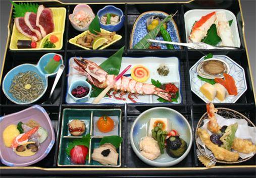 이 사진처럼 버라이어티 풍부한 요리가 총 동원되는 퓨전 스타일의 점보 '쇼카도(松花堂)'도 있다. 쇼카도는 일반 벤토와 달리 음식끼리 맛이나 향이 섞이지 않아 식재료의 고유한 풍미를 즐길 수 있다. 또 우아한 칠기용기는 미적인 아름다움과 고혹적 분위기를 자아낸다.