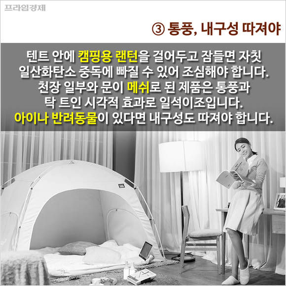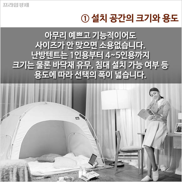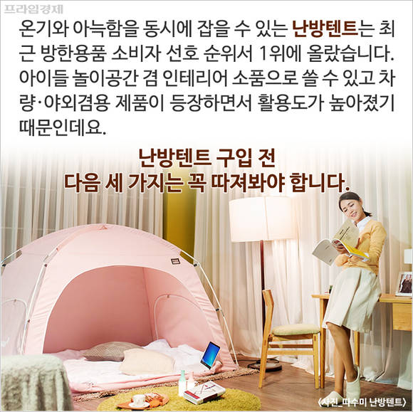 온기와 아늑함을 동시에 잡을 수 있는 난방텐트는 최근 방한용품 선호도 조사에서 1위를 차지할 정도로 인기다. 아이들 놀이 공간 겸 인테리어 소품이 되기도 하고 최근 차량·야외겸용 제품이 등장하면서 활용도가 높아진 까닭이다. 난방텐트 구입 전 고려해야할 점은 크게 세 가지다.