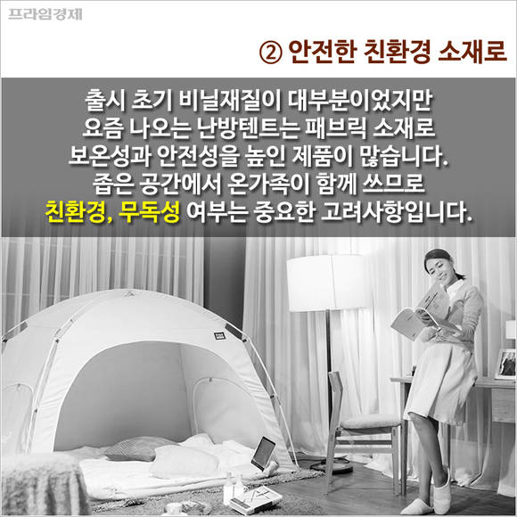 둘째는 안전한 친환경 소재인지 확인하는 것이다. 난방텐트 출시 초기에는 비닐재질이 대부분이었지만 요즘에는 패브릭 소재로 보온성과 안전성을 강조한 제품들이 속속 출시됐다. 좁은 공간에서 온가족이 함께 쓰는 것이므로 무독성, 친환경 소재 여부는 중요한 고려사항이다.