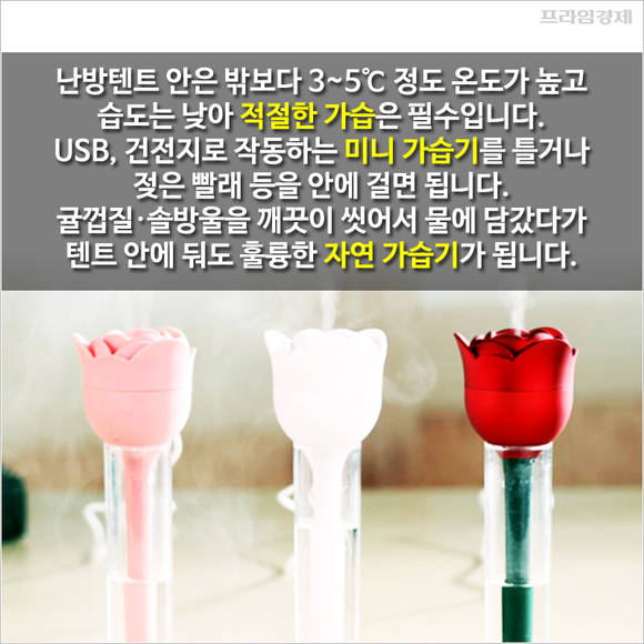 아울러 난방텐트 안은 밖보다 3~5℃ 정도 온도가 높고 습도가 낮아 적절한 가습은 필수다. USB 혹은 건전지로 작동하는 미니 가습기를 틀거나 젖은 빨래·수건을 걸어두면 된다. 귤껍질이나 솔방울을 깨끗이 씻어 물에 담갔다가 텐트 안에 둬도 훌륭한 자연 가습기가 된다.