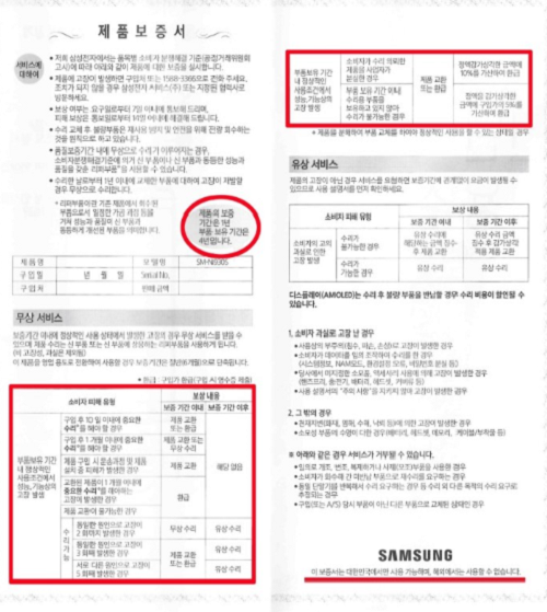 해당 게시글을 보면 갤럭시노트7의 품질보증서에 적시된 제품 보증기간은 1년, 부품보유 기간은 4년이다. 또 제품 보유기간 수리용 부품을 보유하지 않아 수리가 불가능한 경우 제품을 교환 또는 환급해줘야 하며, 보증기간 후에는 정액을 감가상각한 금액에 구입가의 5%를 가산해 환급한다고 명시돼 있다.