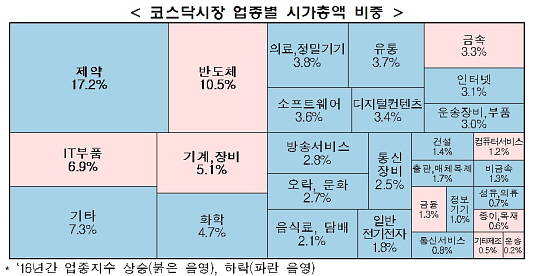 또한 사드배치에 따른 중국 한한령의 영향으로 엔터·게임주들의 속한 오락·문화(-29.30%), 디지털콘텐츠(-29.44%) 업종도 급락했다.