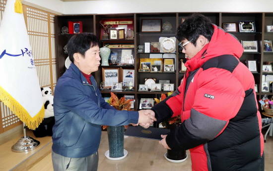 정 시장은 이 자리에서 "아쉽게 천사장사 문턱에서 넘어졌지만 다시 일어나 다음에는 꼭 천하장사에 올라 용인시를 빛내 주기를 바란다"고 격려했다.