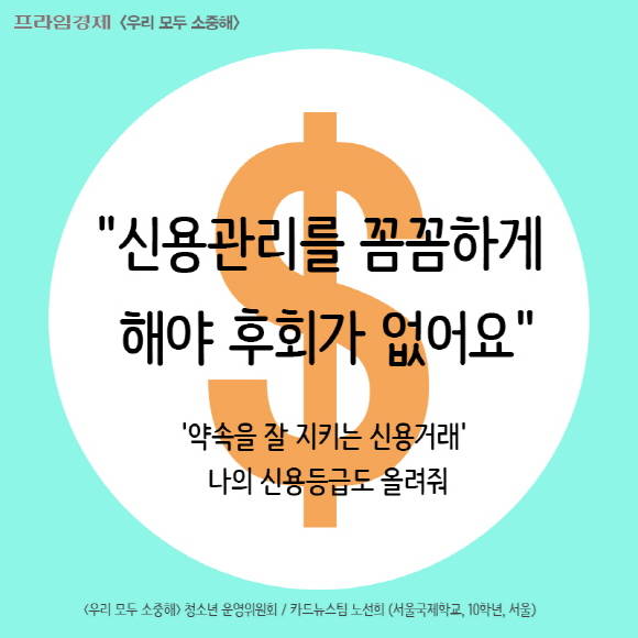 [프라임경제] '우리 모두 소중해' 캠페인의 재능기부 편집위원으로 참여하는 청소년 학생들은 발달장애인들의 감수를 거친 [우리모두뉴스] 기사를 [카드뉴스]로도 제작합니다. 이번에는 서울국제학교 10학년 노선희 학생이 '신용관리를 꼼꼼하게 해야 후회가 없어요' 기사를 카드뉴스로 제작했습니다.
