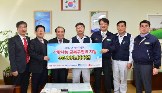 [프라임경제] 광주광역시교육청(교육감 장휘국)이 22일 기아자동차 광주공장(공장장 정찬민)에서 저소득층 학생 교복지원 후원금 3000만원을 사회복지공동모금회 지정기탁을 통해 전달받았다.