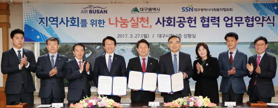[프라임경제] 대구시는 에어부산(사장 한태근), 대구사회복지협의회(회장 이재모)와 '대구지역내 사회공헌 협력을 위한 업무협약'을 27일 오후3시 시청 상황실에서 체결했다.