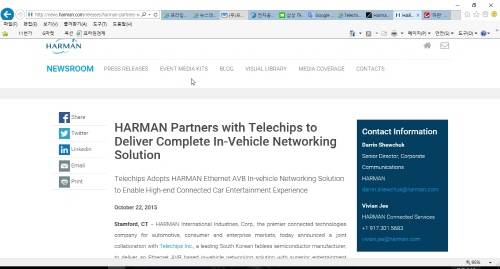 당시 하만 홈페이지에 등재된 기사는 'HARMAN, 텔레칩스와 협력 완벽한 차량 내 네트워킹 솔루션 제공'이라는 제목인데요. 하만과 텔레칩스가 공동으로 이더넷 AVB 기반의 자동차 내 네트워킹 솔루션이 강점인 엔터테인먼트 기능을 제공한다는 내용입니다.