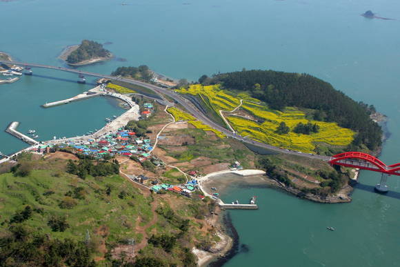 [프라임경제] 사천시가 삼천포대교와 실안낙조 등과 연계한 늑도 유채꽃단지가 노란 물결로 장관을 이루고 있다.