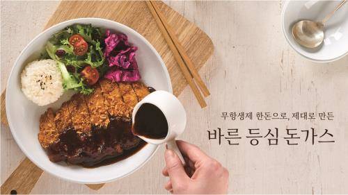 이번에 선보인 바른 등심 돈가스 메뉴는 바른 식재료를 추구하는 브랜드 철학에 맞춰 항생제 없이 키운 한돈 생등심을 사용했다. 여기에 돈가스 특제 소스와 샐러드를 함께 만나볼 수 있다.