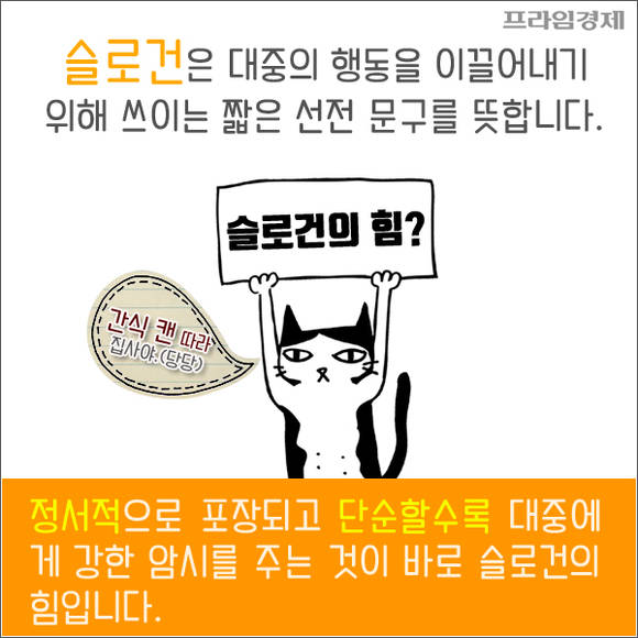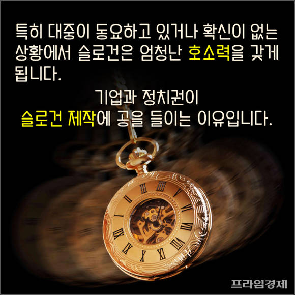 [프라임경제] 슬로건은 대중의 행동을 이끌어내기 위해 쓰이는 짧은 선전 문구로 감성적이고 단순할수록 대중에게 강한 암시를 줄 수 있다. 특히 대중이 동요하고 있거나 확신하지 못하는 상황일 때 슬로건이 발휘하는 호소력은 엄청나다. 이것이 기업과 정치권이 슬로건 제작에 공을 들이는 이유다.