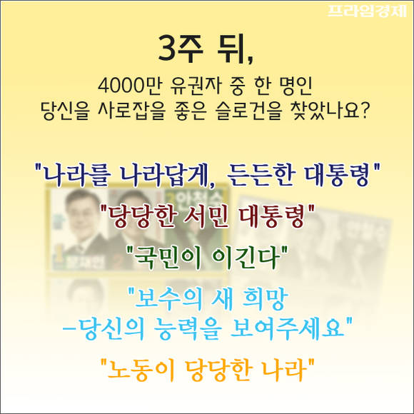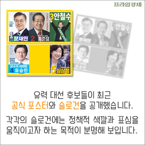내달 9일 치러지는 19대 대통령 선거에 나서는 유력 후보들이 공식 선거운동 개시일인 17일 일제히 공식 포스터와 슬로건을 공개했다. 지지율 상위 5명 후보들의 슬로건은 정책방향을 유추할 수 있는 힌트인 동시에 표심을 움직이고자 하는 목적이 담겨 있다.