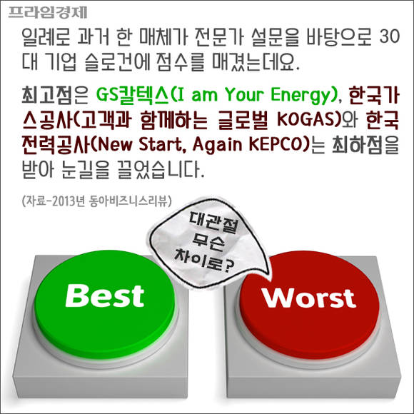 일례로 수년 전 한 매체가 전문가 20여명의 자문과 설문을 통해 30대 기업의 슬로건을 평가한 결과 최고점은 GS칼텍스의 'I am Your Energy'가 차지했고 한국가스공사(036460)의 슬로건 '고객과 함께하는 글로벌 KOGAS'와 한국전력공사(015760)의 'New Start, Again KEPCO'는 최하점을 받아 대조를 이뤘다.