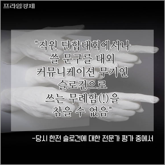 특히 평가단 일부는 한국전력 슬로건에 대해 "무슨 말을 하는지 도무지 모르겠다" "공사 사무실 표어 같은 느낌" "직원 단합대회에서 쓸 문구를 대외 커뮤니케이션 무기인 슬로건으로 쓰는 무례함을 참을 수 없음" 등 송곳 같은 지적을 쏟아내 눈길을 끌기도 했다.