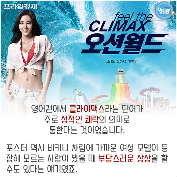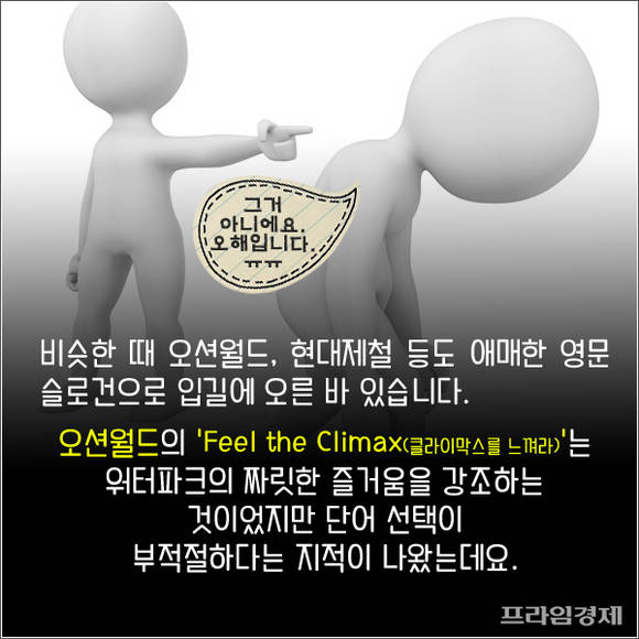 비슷한 시기 대명리조트의 오션월드와 현대제철(004020)도 애매한 영문 슬로건 탓에 입길에 올랐다. 오션월드의 'Feel the Climax(클라이막스를 느껴라)'는 워터파크의 짜릿한 즐거움을 강조하려던 의도였지만 단어 선택에서 일부 오해를 샀다.