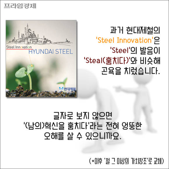 과거 현대제철의 슬로건이었던 'Steel Innovation(철강의 혁신)'은 'Steel'의 발음이 'Steal(훔치다)'과 같다는 점에서 오해 소지가 있었다. 글이나 이미지로 읽어보지 않는 이상 '(남의)혁신을 훔치다'라는 전혀 엉뚱한 오해를 살 수 있다는 얘기다. 물론 지금은 '철 그 이상의 가치창조'로 슬로건이 교체됐다.
