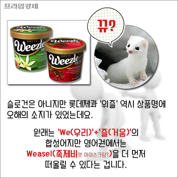 슬로건은 아니지만 발음 때문에 빚어질 수 있는 오해는 롯데제과 아이스크림 '위즐'도 마찬가지다. 월래는 'We(우리)'+'즐(거움)'을 합친 말이지만 영어권 소비자에게는 '족제비(Weasel)'를 먼저 연상시키기 때문이다.