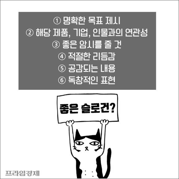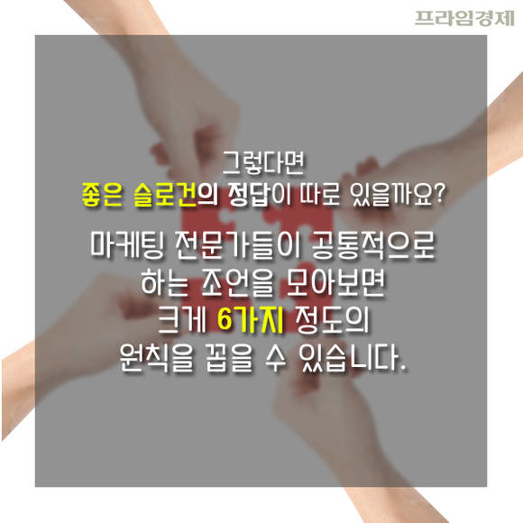 한편 좋은 슬로건의 조건은 무엇일까? 마케팅 전문가들의 공통적인 의견을 모아보면 크게 여섯 가지 정도가 꼽힌다. 좋은 슬로건이 되려면 명확한 목표를 제시해야 하고 슬로건을 통해 해당 제품이나 기업, 사람을 연상할 수 있어야 한다. 또 좋은 암시를 주며 적절한 리듬감을 갖춰야 한다. 대중의 공감을 사는 동시에 독창적인 표현도 중요하다.