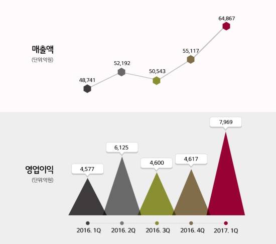 LG화학은 이날 1분기 연결기준으로 매출 6조4867억원, 영업이익은 7969억원의 실적을 거뒀다고 알렸다. 전년동기와 대비하면 매출은 33.1%, 영업이익은 74.1%나 상승한 수치로 사상 최대실적을 올린 지난 2011년 1분기(8313억원) 이래 6년만에 최대치를 기록했다.
