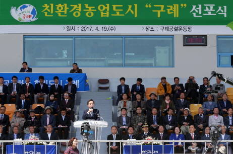 이낙연 도지사는 선포식에서 "구례군은 논밭이 좁고, 산이 많고 도시로부터 먼 악조건을 군민들의 지혜와 열정으로 호조건으로 바꿔 인구가 4년 연속 증가하는 등 활기와 매력이 넘치는 고장으로 탈바꿈했다"며 "2014년 서기동 군수에게 구례군 친환경농업도시 선포를 제안했는데, 3년의 준비 기간을 거쳐 오늘에 이르기까지 노력해준 서 군수와 군민들께 감사드린다"고 말했다.