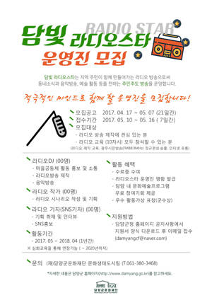 [프라임경제] 담양군문화재단은 지역 주민이 직접 참여·제작하는 라디오 방송 '담빛 라디오스타'에 참여할 DJ, 기자, 작가 등 운영진을 오는 5월7일까지 모집한다.