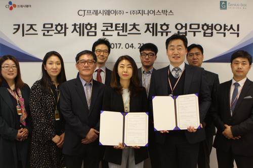 CJ프레시웨이는 지난 21일 영유아 교육프로그램 전문기업 지니어스박스와 업무협약을 맺었다. 이를 통해 고객사 어린이집, 직장 보육시설 등에서 창의·수학·공연·미술·안전 등 교육문화체험 콘텐츠를 선보일 예정이다.