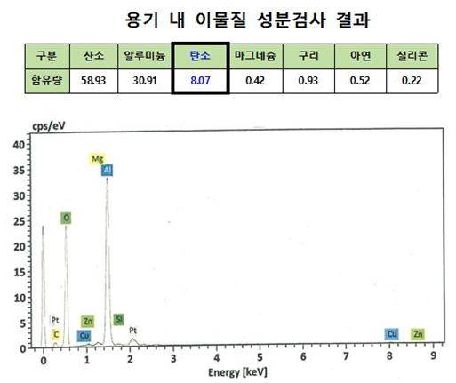 조치사항 보고 및 국회에 제출한 자료에 의하면 용기내 이물질이 용기자체의 문제 아니고 외부 이물질 유입이라는 결정적인 성분분석결과인 다량의 '탄소(C)' 성분이 검출된것을 은폐하고 마치 알루미늄 산화물만 생긴 것으로 허위보고했다.