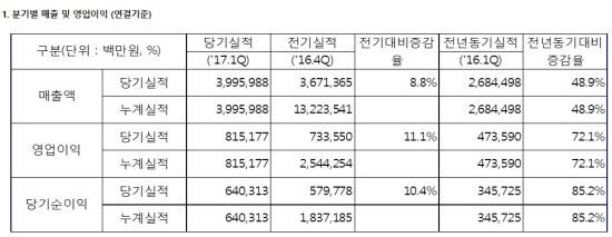 [프라임경제] 롯데케미칼(011170)은 1분기 연결기준 잠정실적 △매출 3조9960억원 △영업이익 8152억원 △당기순이익 6403억원을 기록했다고 27일 밝혔다.
