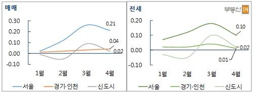 4일 부동산114에 따르면 지난달 서울 아파트 매매가격은 0.21%의 변동률을 나타내며 3월(0.26%)과 비교해 0.05%포인트 변동 폭이 줄었다. 신도시(0.02%)와 경기·인천(0.04%) 역시 가격 움직임이 크지 않았다.
