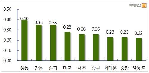 서울 매매가격은 △성동(0.40%) △강동(0.35%) △송파(0.35%) △마포(0.28%) △서초(0.26%)가 뛰었다. 성동은 성수전략정비구역 재개발과 주변 왕십리일대 개발 등으로 매수자들의 기대감이 높아져 성수동2가 IPARK, 행당동 행당한신 등이 1000만~4500만원 올랐다.