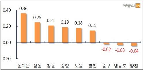 서울 전셋값은 △동대문(0.36%)이 가장 큰 오름폭을 보였고, △성동(0.25%) △강동(0.21%) △중랑(0.19%) △노원(0.18%) 순으로 상승했다. 동대문은 답십리동 청계한신休플러스, 이문동 이문e편한세상 등이 500만~4000만원 올랐다.
