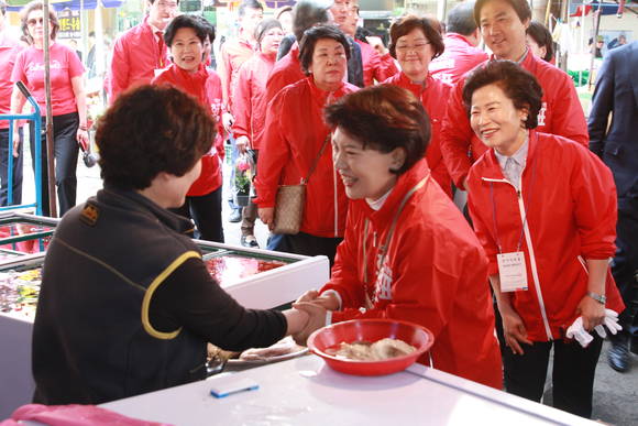 이 여사는 시장 상인들과 손을 잡고 "자유대한민국을 이끌어갈 유일한 대통령은 오직 홍준표 후보 뿐"이라며 "소중한 한 표를 행사해 달라"고 호소했다.