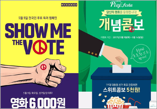멀티플렉스 영화관도 일제히 투표 독려에 앞장섰다. 롯데시네마는 투표 확인증 지참 고객에게 8500원짜리 스위트콤보를 5000원에 내놓고 메가박스는 투표 참여 고객을 대상으로 모든 지점에서 영화 관람권을 6000원에 판매하는 '쇼미 더 보트(Show me The Vote)'를 진행한다.