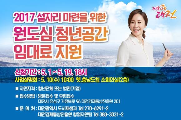 [프라임경제] 대전광역시(시장 권선택)는 원도심의 빈 점포 등 유휴공간에 청년공간을 마련하고, 이를 활용하는 청년단체 및 기업(법인)을 지원하는 '청년공간 임대료 지원사업'을 벌이고 19일까지 신청자를 받는다.