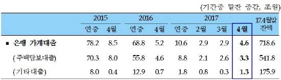 다만, 가계대출 증가 폭은 1년 전보다 줄어들었다. 은행 가계대출 증가액은 지난해 4월(5조2000억원)보다는 6000억원 줄었다. 같은 기간 주택담보대출도 1조3000억원으로 감소했다.