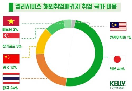 켈리서비스를 통해 작년 취업한 90여명의 취업 국가는 일본, 싱가포르 등 비교적 기존에 한국인의 접근이 용이한 선진국과 태국, 중국, 말레이시아, 베트남, 라오스 등 청년의 취업 기회가 많은 개발도상국 8개국으로 분포됐다.