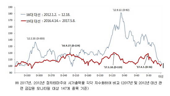 금융위 관계자는 "18대 대선 당시 정치테마주 주가가 대선일 3개월 전까지 지속 상승한 후 하락한 반면 19대 대선에는 대통령 탄핵 등 정치적 이슈에 따라 대선 직전까지 등락을 반복했다"고 설명했다.