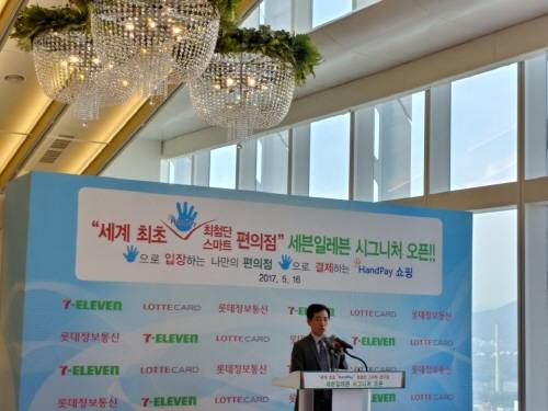 16일 잠실 롯데월드타워 31층에 오픈한 무인 편의점 '세븐일레븐 시그니처' 간담회의 단연 화두는 '핸드페이(Hand Pay)'.